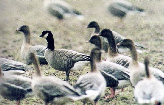 Following this decision, a number of candidates were considered by BOURC for subspecies-level acceptance, resulting in a unanimous decision that the Holkham Freshmarsh individual from November 1999 showed features consistent with the subspecies B. h. hutchinsii. Furthermore, there was no evidence of a captive origin, with the bird seen in a flock of Pink-footed Geese Anser brachyrhynchus, a plausible carrier species for a vagrant crossing the Atlantic. Thus the record and subspecies was accepted to Category A.