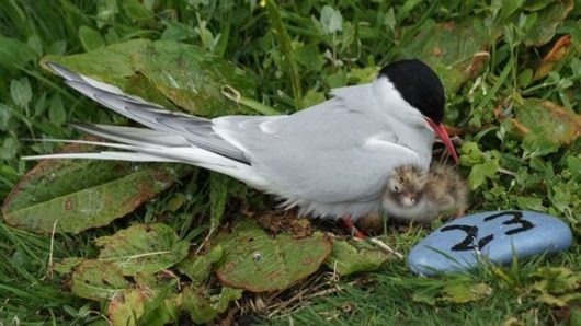 Figure 1 Arctic Tern Sterna paradisaea, with chick, on the Farne Islands. The numbered stones allow the nests to be easily monitored and the nesting success recorded © Michael Pentleton