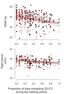 Pied babbler nestlings at 11-days old are negatively affected by high temperatures, being both lighter (by body mass in grams) and smaller (by tarsus length in mm) when there has been a high proportion of days during the nestling period above the critical temperature threshold of 35.5 °C. However, there was no difference between male and female nestlings in terms of either body mass or tarsus length, and maximum air temperature affected male and female nestlings in the same way (Fig. 3).