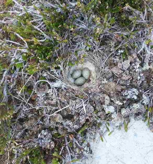 For a high elevation, alpine population of the small-bodied, ground-nesting Horned Lark, Eremophila alpestris, environmental conditions during the breeding season can be harsh and unpredictable. The reality of the environmental variability to which these larks must contend can be difficult to visualize until one experiences it first-hand. This reality became crystal clear at 06:00 hrs on May 30th 2015, approximately 1800 m above sea level near Smithers, British Columbia, and about a month in to the first season of a project addressing life-history variation within a population of Horned Larks. Approximately 60% of the snow in the alpine had already melted by this time and breeding was in full swing, with 25 breeding pairs already incubating. However, the previous 12 hrs had brought a cold storm that dumped several centimetres of fresh snow, resetting the alpine back to a state of winter overnight. We expected to find most, if not all, of the nests abandoned. Rather, the first nest we checked that day was found completely dry and intact with 3 warm eggs and snow cover right up to the edge of the nest (Fig. 1). This was not an abnormal case. Of the 25 nests checked that day, all were active, and over an entire season which included several cold, harsh snow storms only 4 of 97 nests were abandoned.