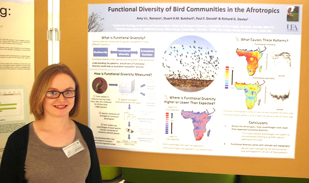 And the winner is . . . Becky Laidlaw! Here she receives a copy of Ethno-ornithology (kindly donated by Taylor & Francis) and £50 prize from BOU President, Jenny Gill (who happens to be Becky’s supervisor, but Jenny didn’t vote on the posters – honest!)