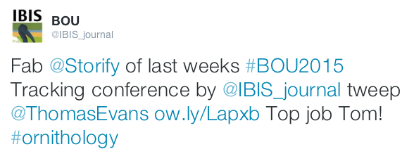 - Get someone to summarise the social media activity either as part of the conference summary on your own website (see here) or as a #Storify article (see Tom Evans’ great #Storify of #BOU2015).