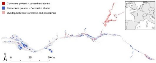 The conservation of the Corncrake is frequently advocated as a means of conserving local grassland ecosystems. Hence, conservation measures aimed at protecting the Corncrake are also expected to protect the other grassland bird species, especially those that are also at risk from human practices. This desirable side-effect characterises a so-called umbrella species, that is, a species whose conservation benefits all species sharing the same habitat (Caro & Doherty 2003).<!–?p ></p> <p>One of the last populations of Corncrake in France breeds in floodplain meadows along the western banks of the Loire river and some of its tributaries. Here, agri-environmental schemes were implemented to maintain the Corncrake population, but they were also supposed to benefit a larger number of species. Among them are four ground nesting passerines that occur in the same grasslands and whose breeding seasons overlap (Figure 1). It is assumed that the corncrake and these passerines really co-occur in the same areas and share the same environmental requirements. However, this crucial information was never formally quantified. Therefore, the question remains as to whether the Corncrake has the potential to act as an effective umbrella species in this area.