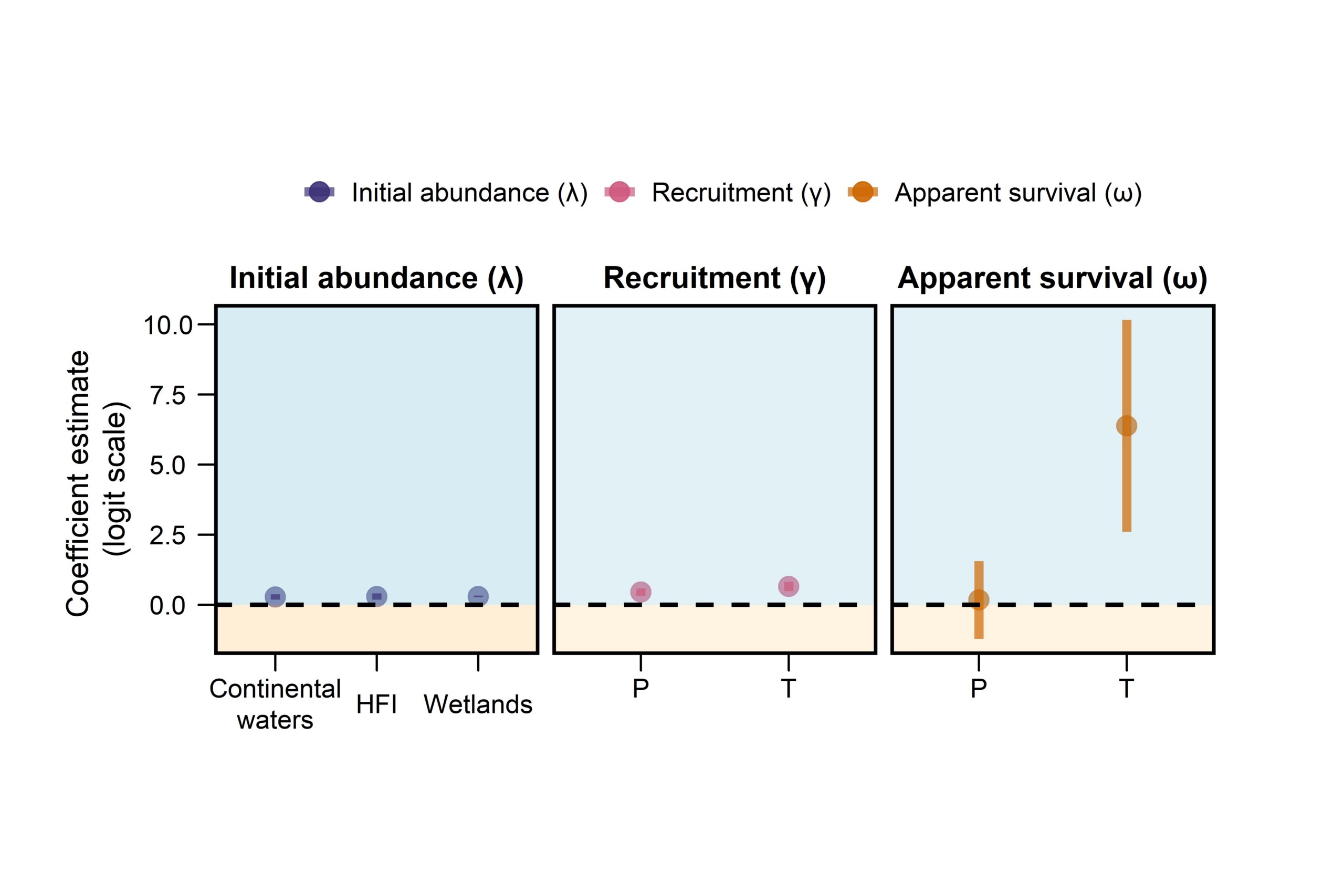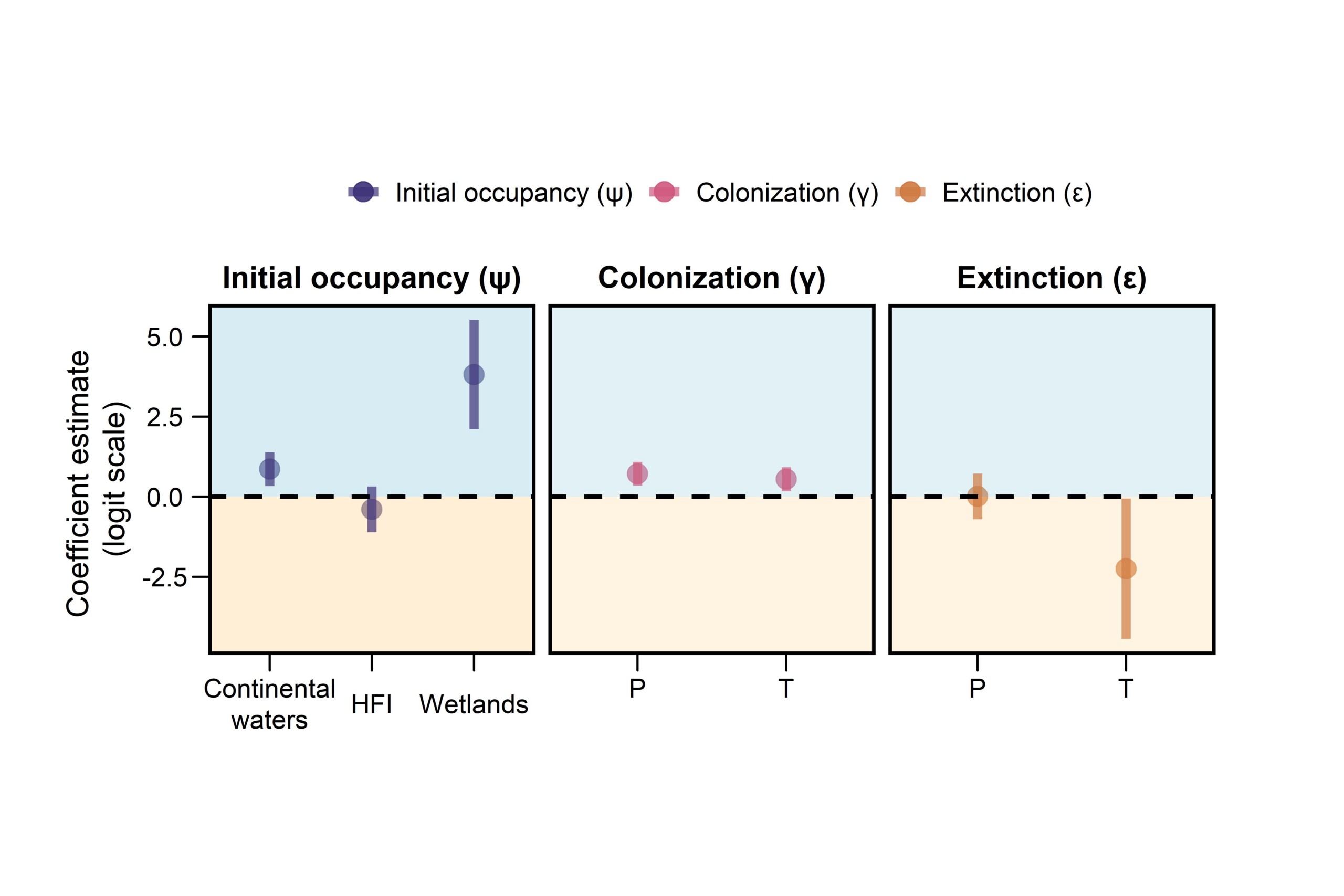 Figure 3a. Influence of bioclimatic factors on occupancy probability. HFI = Human Footprint Index; P = Cumulative precipitation; T = Mean temperature.