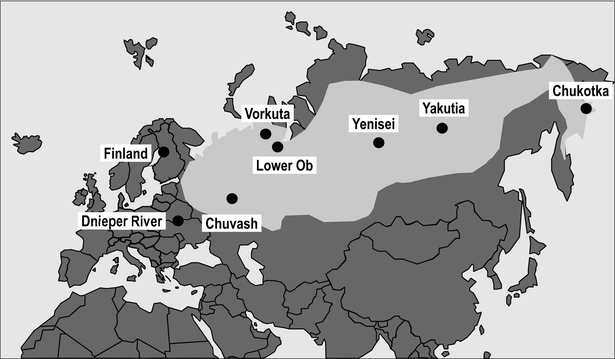 Figure 1The main breeding distribution (light grey) and sampling sites (black circles) of the Terek Sandpiper.
