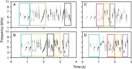 Figure 1 Sonograms of four song variants of one male Rufous-capped Warbler. Different syllables are marked with colored boxes.