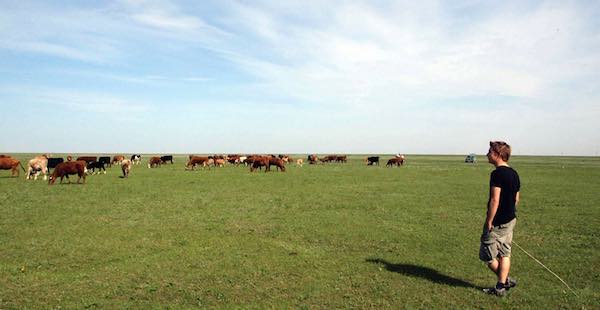 We set out to test some of these hypotheses: data loggers were installed that recorded nest cup temperature in active nests and in a controlled experiment with artificial nests, adding varying amounts of dung. Pitfall traps were buried at nests and random locations to assess spider and beetle numbers. But how to test the idea of the dung pavements acting as ‘anti-trampling devices’? Nothing easier than that – just ask a local shepherd to lend you their cattle herd for a few days and set up a large-scale trampling experiment. An extensive grid was prepared in the steppe, and clay disks that mimicked nests and would break when stepped on were placed at 100 grid nodes in a regular manner. Half of the artificial nests were fitted with dung pavements resembling those of the Black Larks, and half were left blank without dung. The amused 92 research cattle were then driven onto this grid on six days, and remained there grazing for one hour. Afterwards, the frequency of broken artificial nests with and without dung was calculated.
