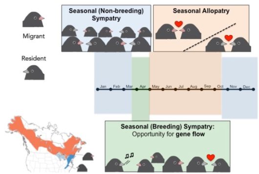 Figure 1 Resident and migrant juncos are found in seasonal sympatry during the winter months and early breeding season (see blue on map). Migrants and residents return to seasonal allopatry (i.e. populations are geographically isolated) after the spring migration when migrants return to their breeding grounds (see orange on map) © Figure adapted from Fudickar et al. 2016; designed by J.W. Atwell.