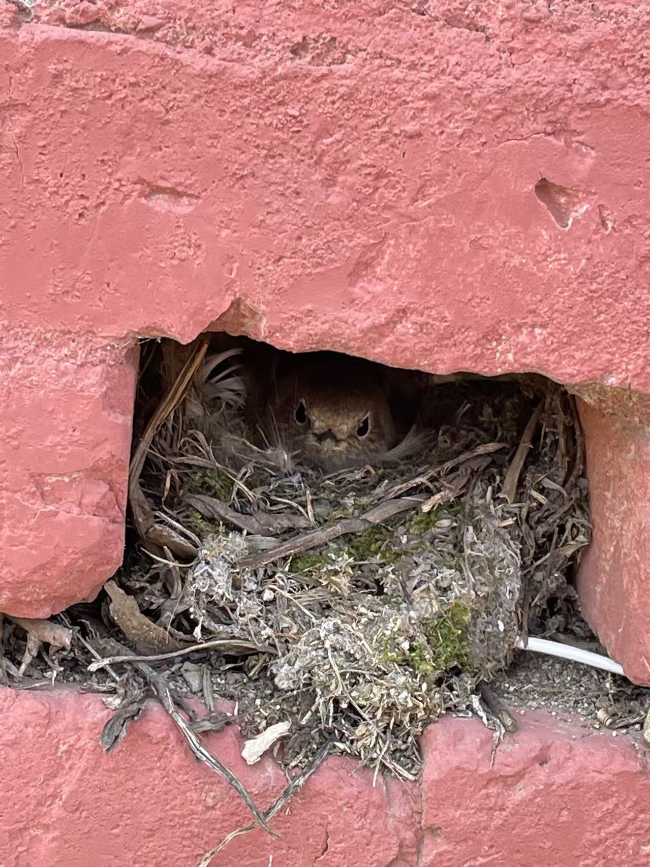 Figure 2. Nest of a Daurian Redstart in a brick crevice, with a female incubating eggs.