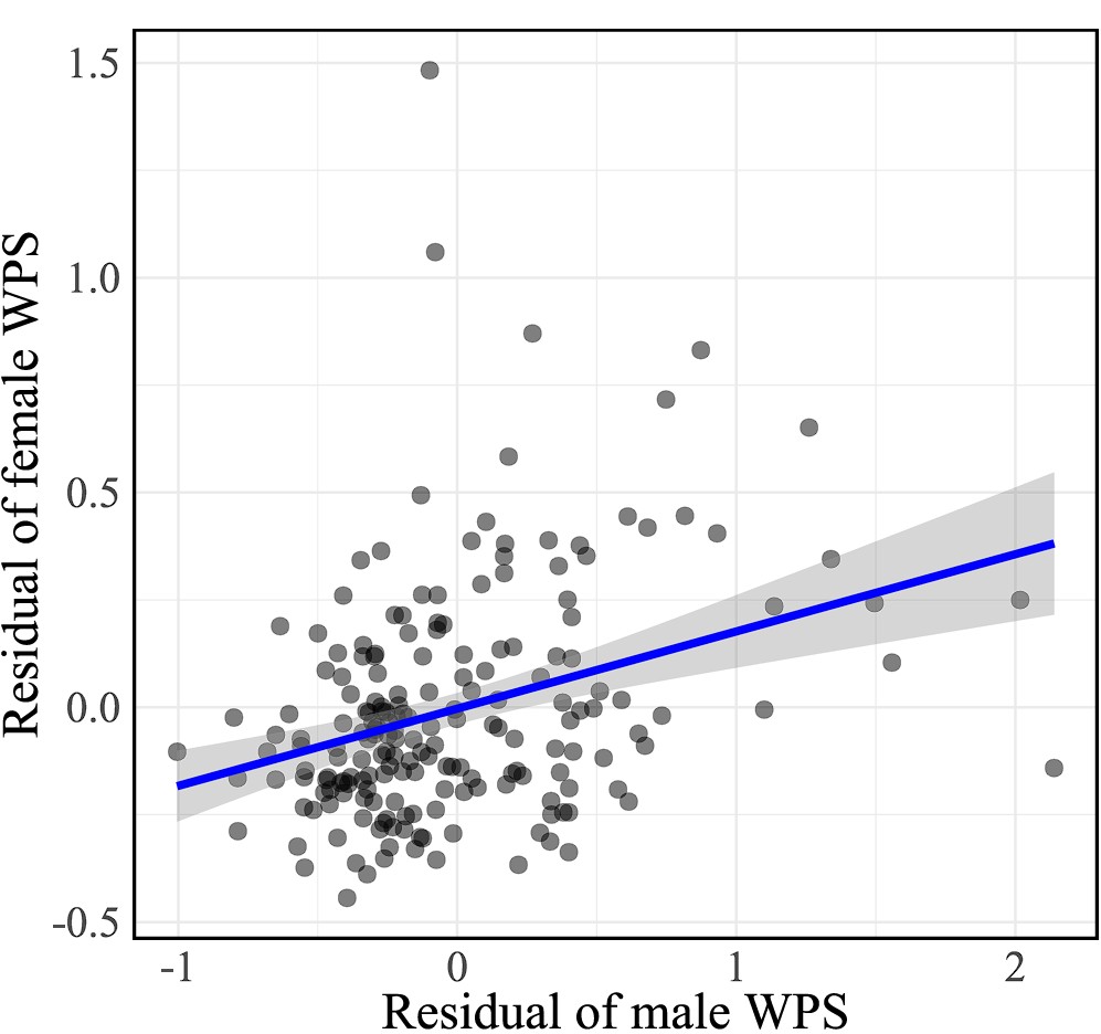 Figure 3. Spearman’s rank correlation between male and female wing patch size (WPS) residuals relative to wing length. The grey shaded area represents the 95% confidence interval.