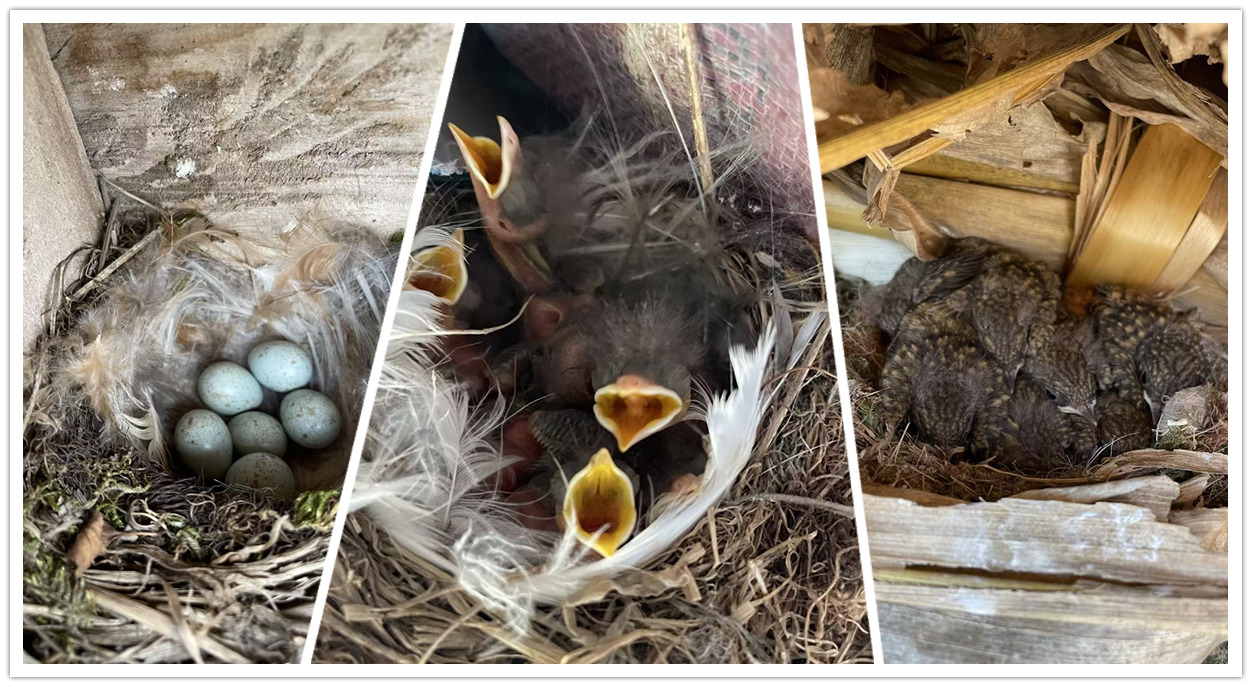 Figure 4. Left: blue-type eggs of the Daurian Redstart; middle: 5-day-old nestlings; right: 12-day-old nestlings.