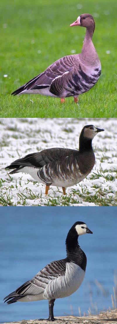 A cold and misty morning in December. Three men are waiting on the edge of a grassland for the mist to disappear. A few minutes later, a noisy symphony of honking fills the air. Thousands of geese waddle across the grassland. The men immediately grab their binoculars and start scanning the flocks for rare species. Suddenly, one of the birdwatchers starts mumbling: ‘What kind of …?’ He expertly guides his friends’ binoculars towards an abnormal specimen in a group of Greater White-fronted Geese Anser albifrons. What species are we dealing with? Bird guides are consulted, but they do not provide an outcome. Finally, one of the birdwatchers proposes a controversial idea, could it be a hybrid? It has characteristics of Greater White-fronted Goose and Barnacle Goose Branta leucopsis. After a short re-examination of the special goose, they agree. They are dealing with Greater White-fronted Goose x Barnacle Goose. The mystery is solved and they continue scanning the flocks in search of rare species.