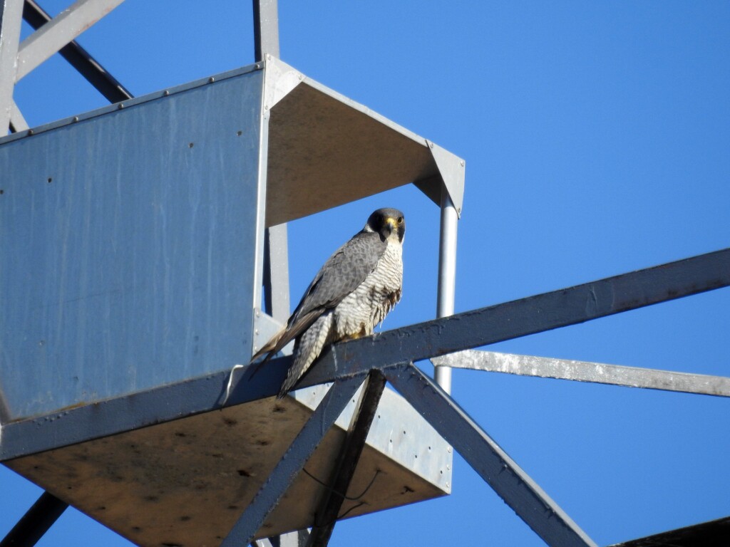 Figure 4. Adult female Peregrine Falcon perching at an artificial nest box on a high-voltage transmission line tower. © Mátyás Prommer