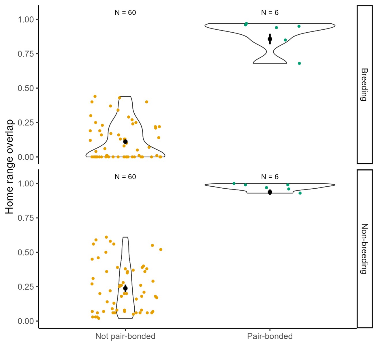 Figure 3. Violin plots of home range overlap (Bhattacharyya coefficient) in pairs of Chirruping Wedgebills (N=66) during the breeding and post-breeding season calculated using the strongest detection method. Pairs are classified as non-pair bonded dyads (orange) and pair-bonded dyads (green). Black dots and lines depict the model prediction ± SE. After Speelman et al., 2025.