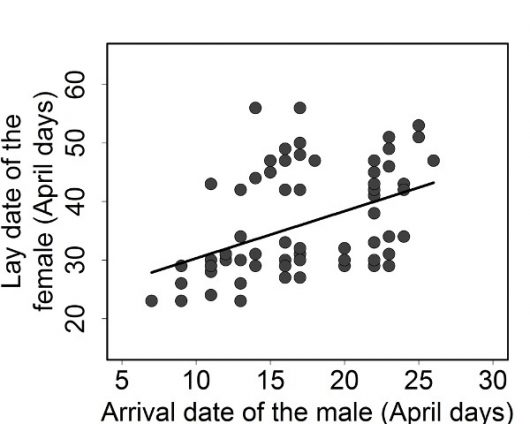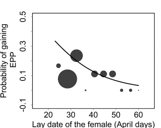 We found that if a male pairs with a female that lays her eggs early in the season, he will have an increased probability to gain EPP in another nest. However, his arrival date alone does not lead to the same pattern. This was a curious finding because early-arriving males also tend to have females that lay early. This seems to be caused by the large variation in the relation of male arrival and female egg-laying; in other words, early males may still end up with late egg-laying females and vice-versa, blurring any relation between male arrival and gains in EPP.