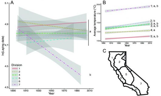 Does this mean that all House Finches across California are laying eggs earlier now than they were a hundred years ago? Not necessarily. Although average spring temperatures have increased across the state, long-term changes in the timing of laying vary regionally. Only in the hottest region of the state, the southeast desert basin, did we find a long-term advancement in the timing of egg laying (Figure 1). Other regions of the state, which are considerably cooler on average, do not show the same changes over time. It may be that temperatures in these areas have so far remained low enough as to not induce long-term shifts.