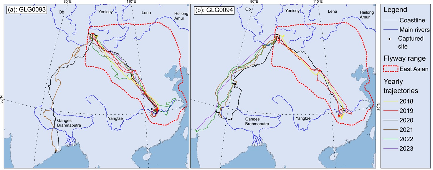 To test this long-standing assumption, we compiled more than a decade of satellite tracking data collected across East Asia. In total, we analysed data from 619 tagged individuals from eight goose and swan species (Greylag Goose, Swan Goose, Taiga Bean Goose, Tundra Bean Goose, Greater White-fronted Goose, Lesser White-fronted Goose, Tundra Swan and Whooper Swan), representing ten biogeographical populations.