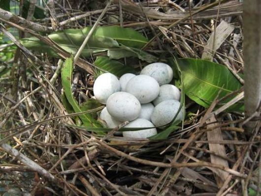 Steve and I decided that we needed to test the second hypothesis: that the vaterite coating might reduce the risk of shell fracture during incubation. We already suspected that ani eggshells might need to be unusually strong, since clutch sizes are very large – with up to four females laying in one nest, each clutch can contain up to 20 eggs (Fig. 2)! Large clutches mean that the eggs roll and knock against each other every time the incubating adult moves the eggs around in the nest (a necessary behaviour that prevents the embryo from sticking to the eggshell and ensures that each egg gets the right amount of heat during incubation).